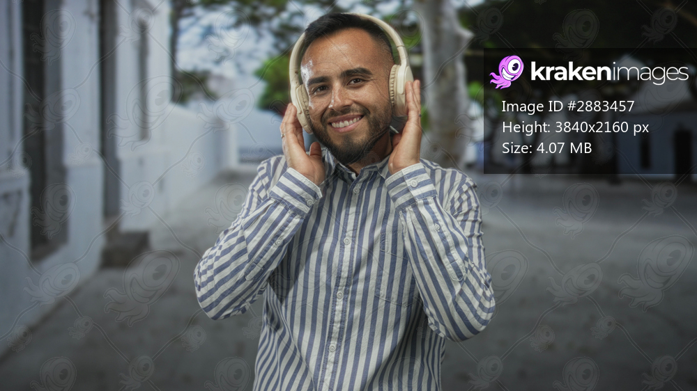 Man wearing over ear headphones gives thumbs up with visible thumb and broad smile on a sunny street lined with white buildings and trees; confidence.