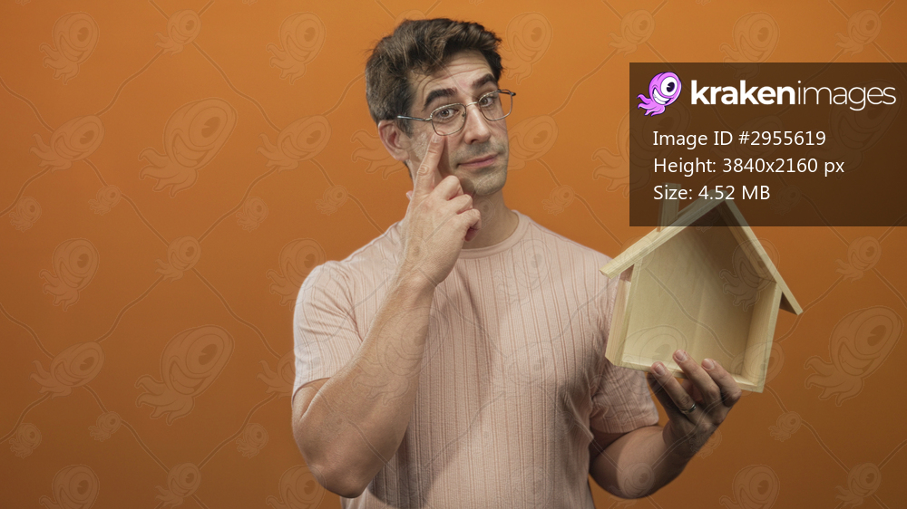 Man wearing pale pink shirt holding wooden house points finger to glasses in studio; uncertainty home decision.