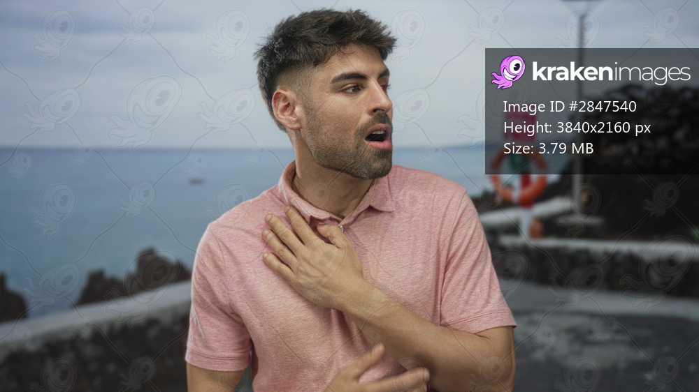 Man wearing pink shirt clutches chest in thankful gesture on seaside street by lifebuoy and stone wall; gratitude.