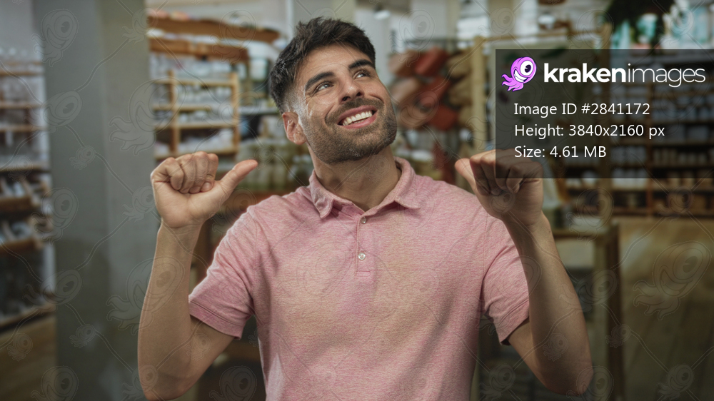 Man wearing pink shirt smiling and pointing thumbs to himself in shop building amid shelves of home decor items; confidence.