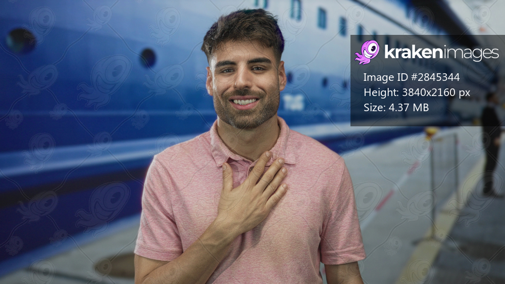 Man wearing pink shirt stands with hand on chest before docked cruise ship on coastal street; gratitude.