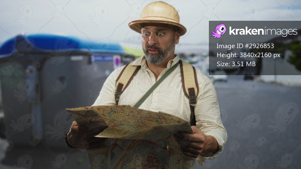 Man wearing pith helmet and backpack holding a folded map and frowning in a city street beside a recycling container and trash bin; confusion.