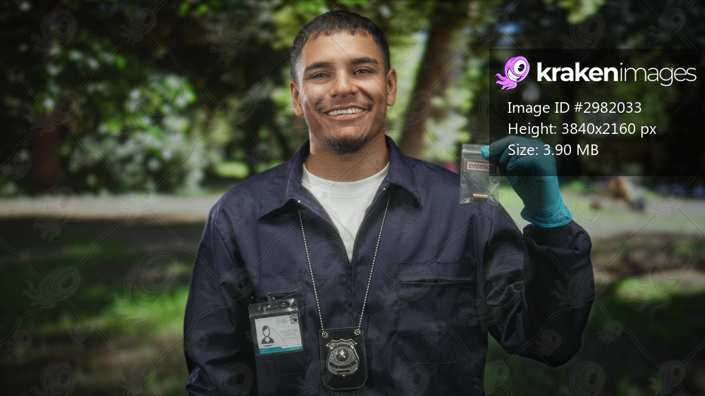 Man wearing police badge holds small evidence bag with a bullet cartridge in a forest park, gloved hand raised and smiling; investigation professionalism duty. - Kraken Images