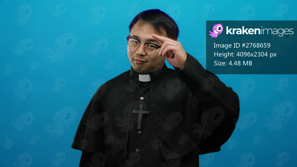 Man wearing priest attire posing against blue background confidently indicates a calming religious concept inspiring trust and faith through gesture and expression. - Kraken Images