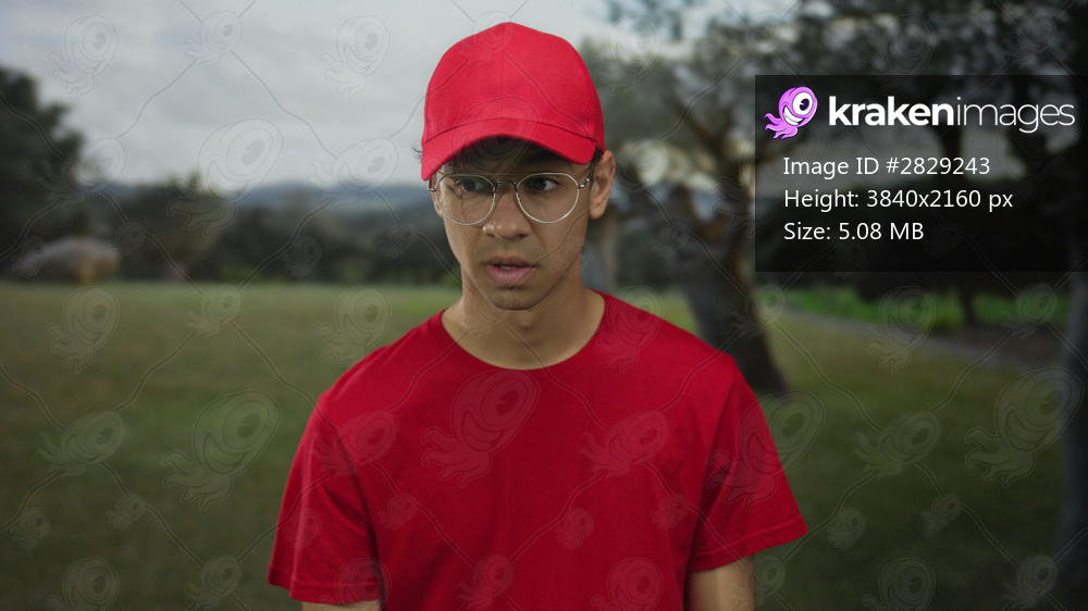 Man wearing red cap, eyeglasses, and red shirt with closed eyes stands in green forest near trees; contemplation.