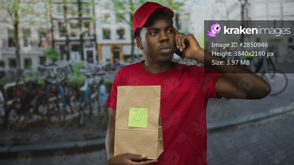 Man wearing red cap and holding paper bag with yellow sticky note and talking on phone on street; delivery service urgency.