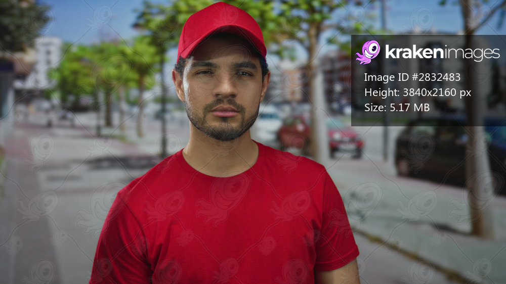 Man wearing red cap and red shirt with exposed face standing beside parked car on street; confidence focus.