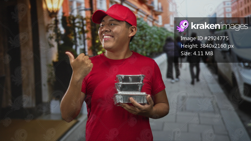 Man wearing red cap and red shirt holding takeout containers and smiling while giving thumbs up on busy city street; cheerful delivery service.