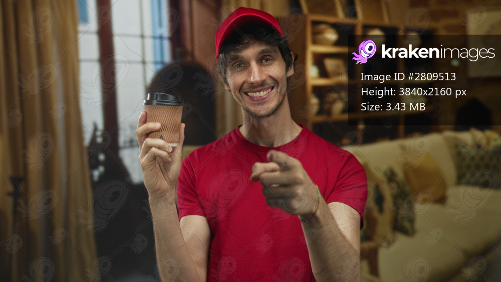 Man wearing red cap and red shirt holds coffee cup and points finger to it in a cozy living room; friendly invitation.