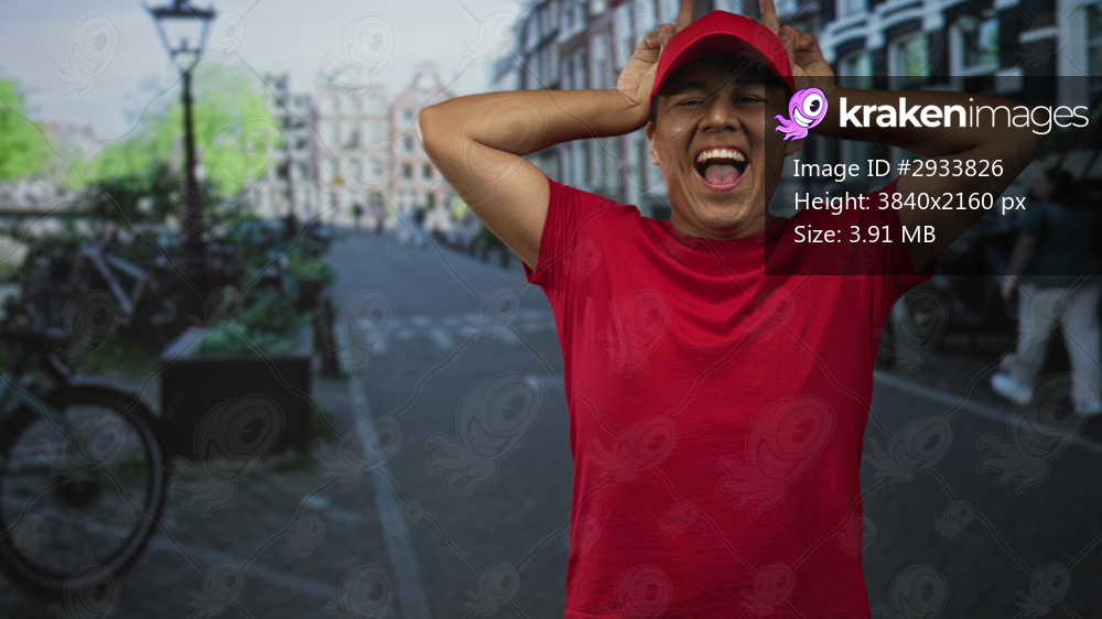 Man wearing red cap and red shirt making bunny ears with hands, smiling with mouth open on a cobbled city street; joy playfulness youth.