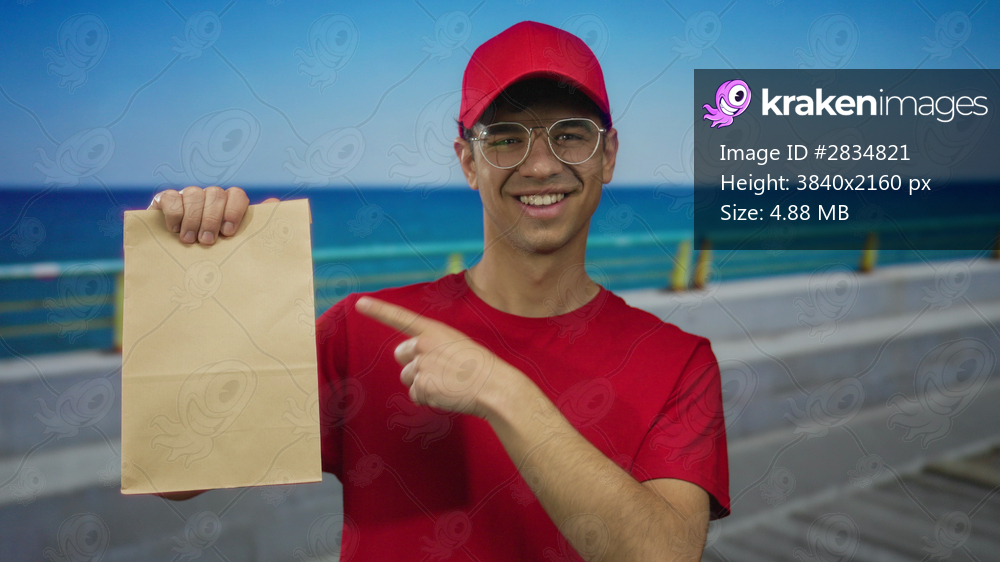 Man wearing red cap and shirt holding a paper bag and pointing finger to bag on street promenade by seaside; reliability convenience.