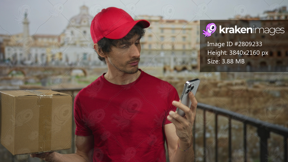 Man wearing red cap and shirt holds cardboard box and smartphone on roman street in soft morning light; uncertainty.