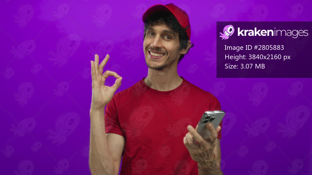 Man wearing red cap and shirt taps smartphone then shows ok sign against purple backdrop in studio; confidence approval connection communication.