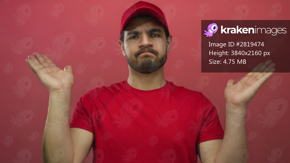 Man wearing red cap and t shirt holding both palms up facing camera in studio with puzzled expression; uncertainty.