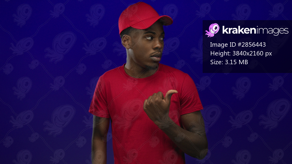 Man wearing red cap and t shirt pointing thumb to side against blue studio wall; direction choice suggestion confidence.