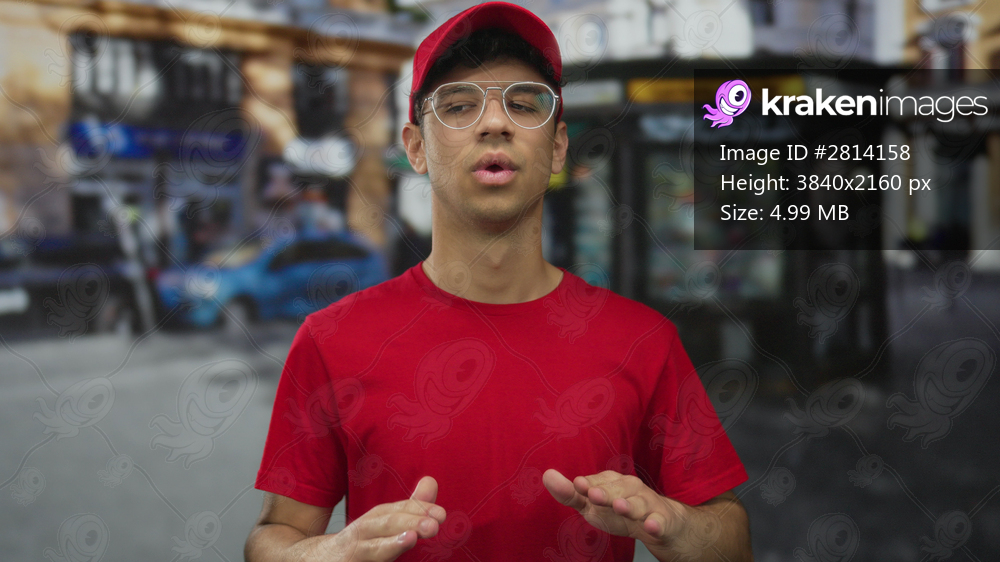 Man wearing red cap and t-shirt stands on city sidewalk in a busy street scene with focused posture; confidence.