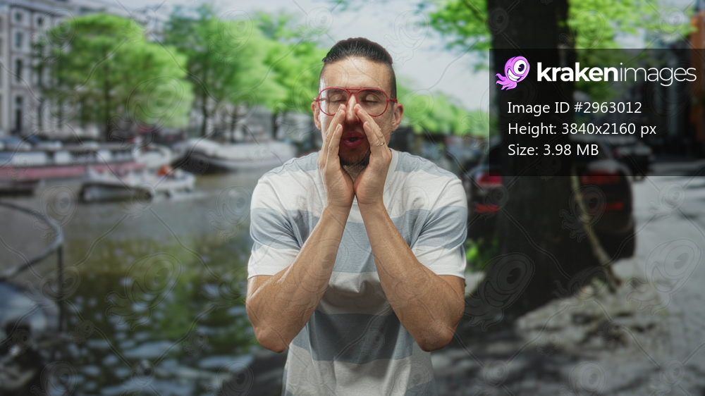 Man wearing red glasses cups hands to mouth on tree lined canal street with boats, bare forearms visible; public call urgent.