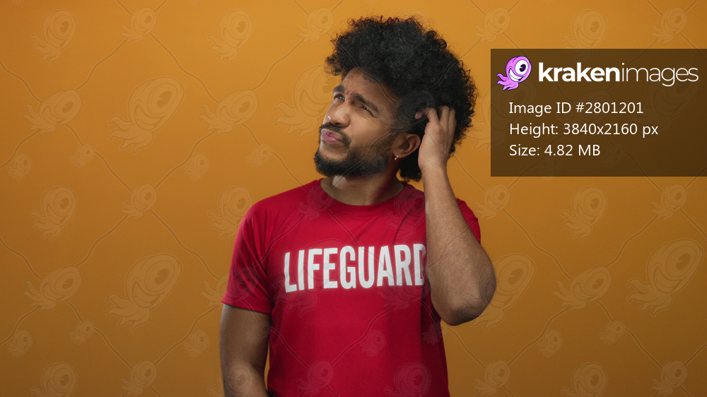 Man wearing red lifeguard shirt standing against orange background looking confused capturing a moment of contemplation and curiosity.