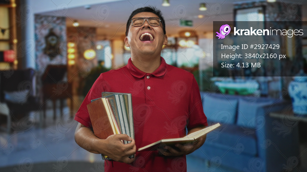 Man wearing red polo and glasses holding several books and reading while smiling in a hotel building lobby; study joy.