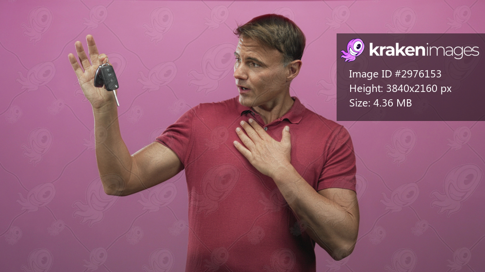 Man wearing red polo holding car keys and key fob in raised hand while the other hand rests on chest in studio; pride achievement.