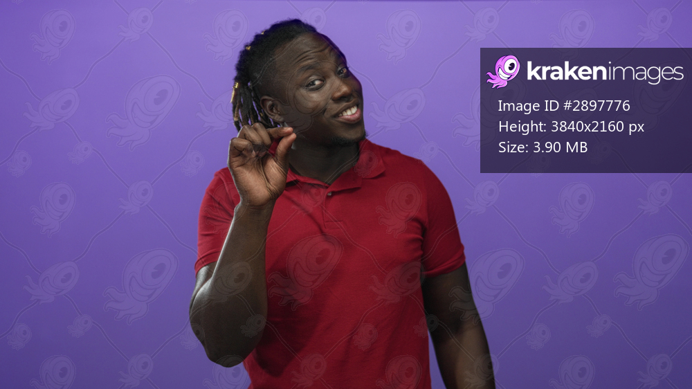 Man wearing red polo shirt holding ok sign with hand and fingers in a studio with purple backdrop; approval confidence.