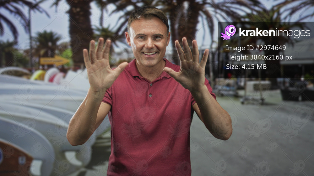 Man wearing red polo shirt showing open palms and pointing fingers on a street near stacked surfboards and palm trees; playful greeting.