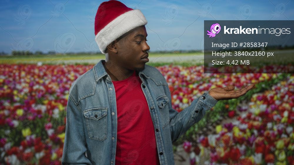 Man wearing red santa hat and denim jacket holds palm open toward camera in forest clearing under bright blue sky; serenity contemplation calm reflection. - Kraken Images