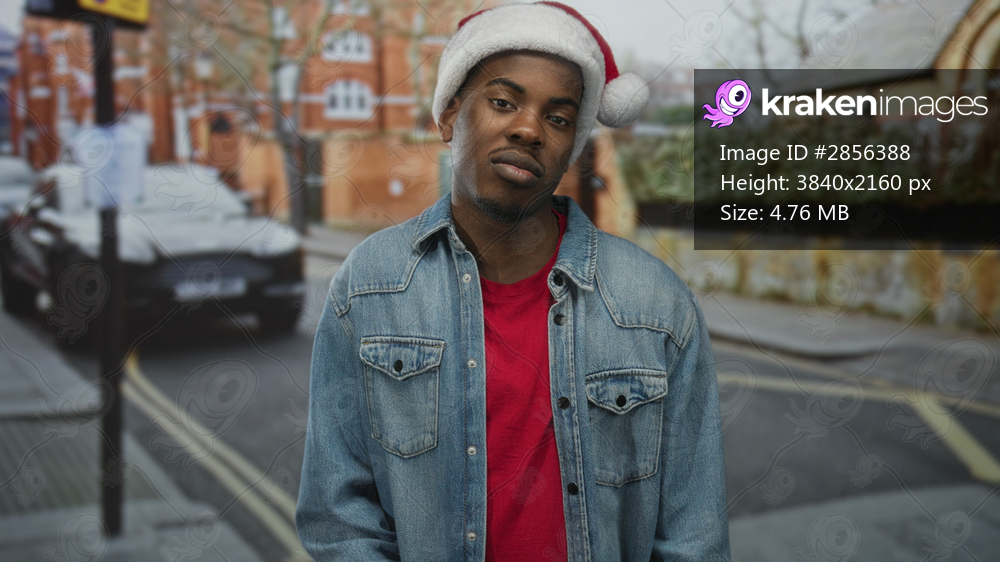 Man wearing red santa hat tilts head while gazing downward in denim jacket on city street; reflection calm.