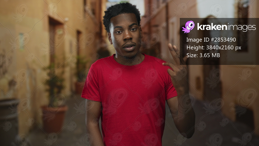 Man wearing red shirt with finger gun to head and closed eyes in old town narrow street; desperation.