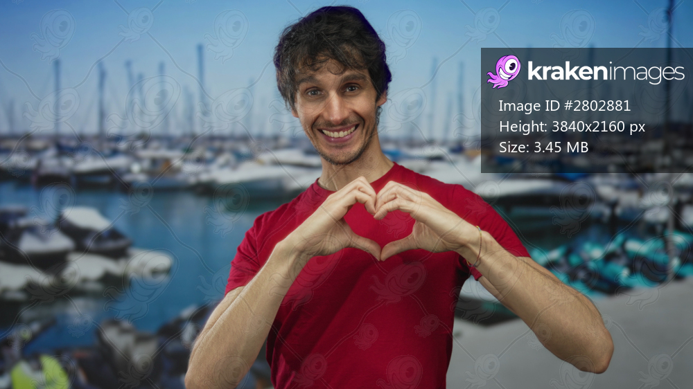 Man wearing red shirt forming heart shape with hands on sunlit street near boats and yachts in port; love.