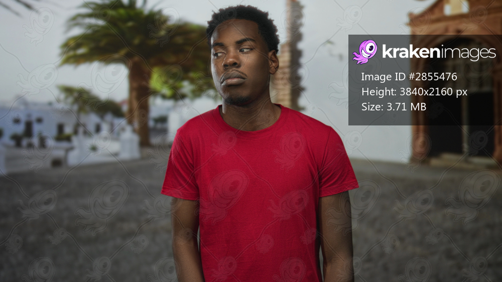 Man wearing red shirt glances sideways on city street under palm tree against historic building facade; inner contemplation.