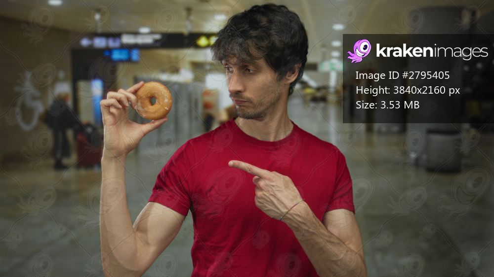 Man wearing red shirt holds glazed donut in hand and points finger in busy airport terminal; skepticism.