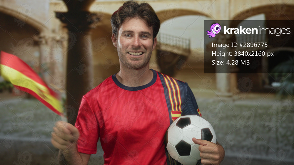 Man wearing red soccer jersey holding a black and white soccer ball and waving a small spanish flag in historic building courtyard with arches and plants; national pride celebration. - Kraken Images