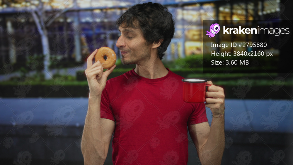Man wearing red t shirt holding donut and mug on urban city street at night under street lights; happiness.