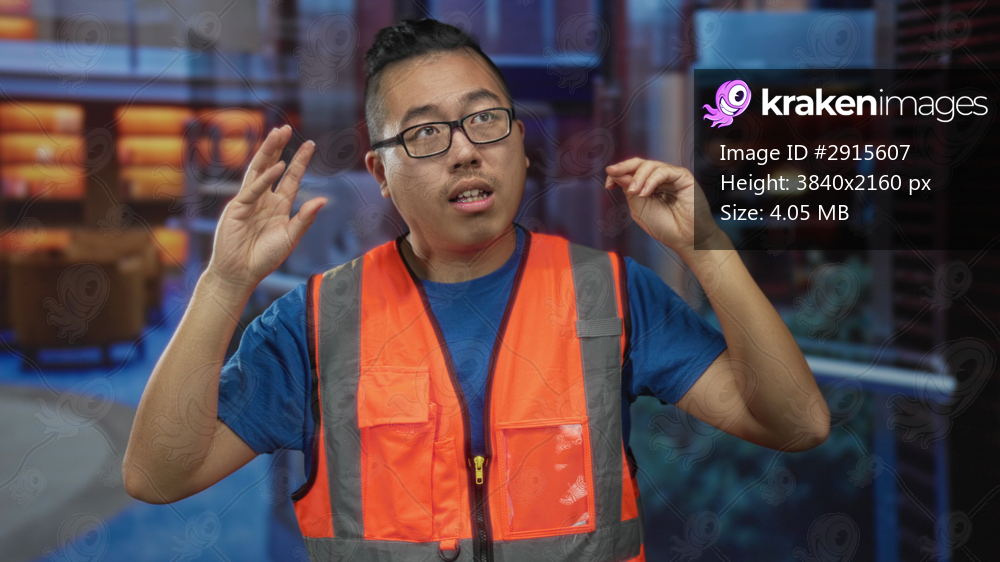 Man wearing reflective safety vest and glasses gestures with both hands raised in hotel lobby building near seating area; confusion delay.