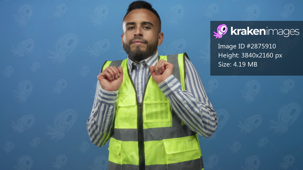 Man wearing reflective safety vest gripping the collar with both hands in a blue studio; apprehension.