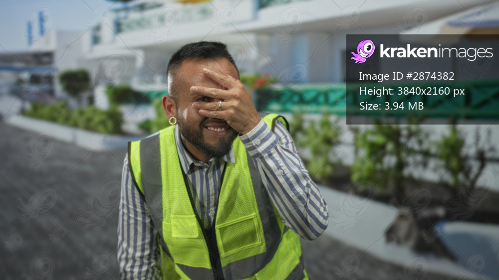 Man wearing reflective safety vest and striped shirt covers face with hand while smiling, showing ring and earring in front of a building facade and balcony; embarrassment. - Kraken Images
