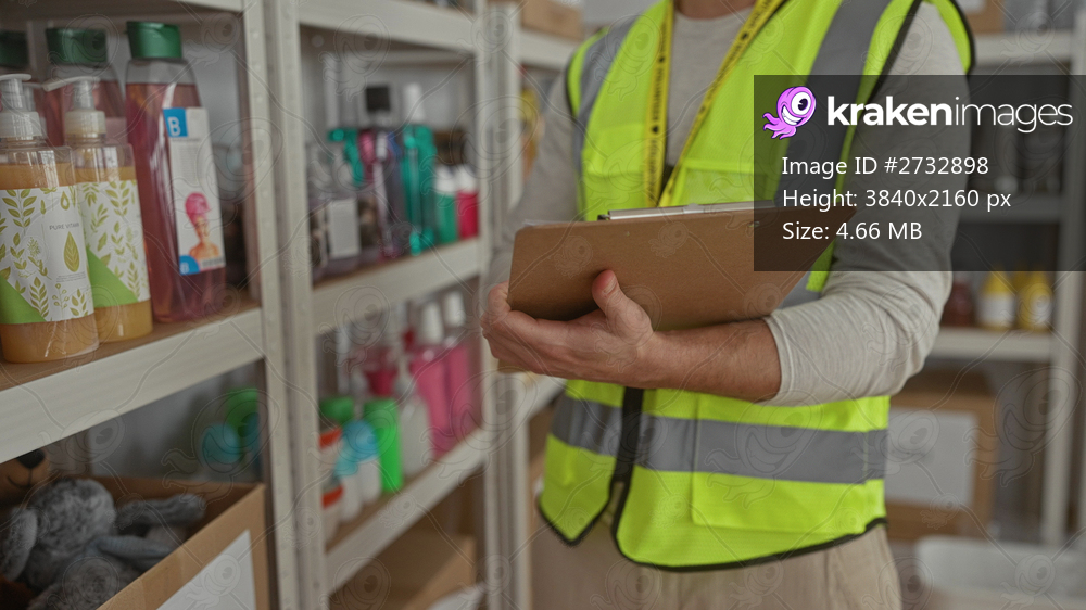 Man wearing reflective vest holding clipboard inside charity donation center room organizing supplies for distribution during volunteer work