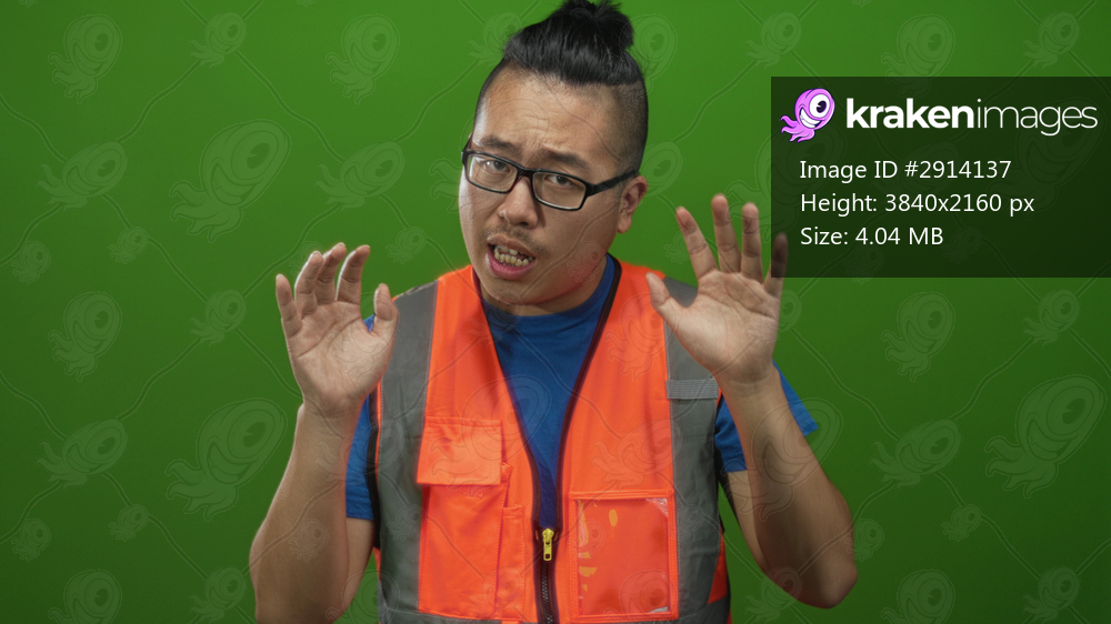 Man wearing reflective vest raises both hands palms out toward camera in green studio; safety concern warning.