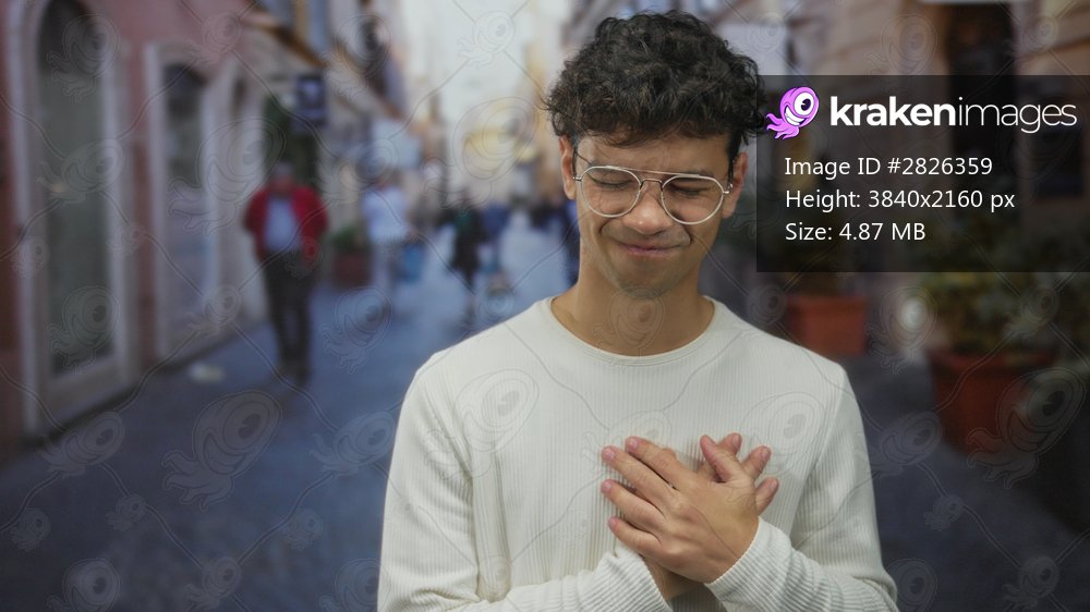 Man wearing round glasses and white sweater holding hands to chest on crowded city street; gratitude.