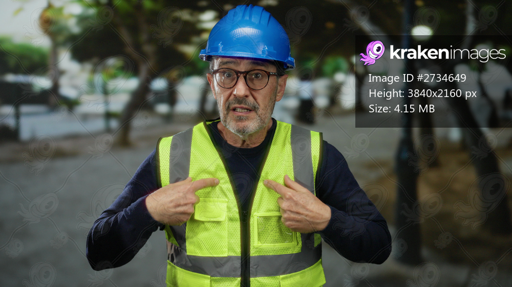 Man wearing safety gear points to himself in urban park, featuring high-visibility vest and blue helmet in an outdoor city environment.