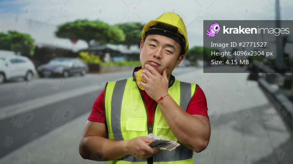 Man wearing safety vest and helmet stands thoughtful on city street holding cash in hand, reflecting urban lifestyle challenges with a focus on finance and construction. - Kraken Images