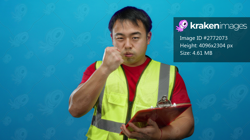 Man wearing safety vest holding clipboard against blue background showing determined expression.