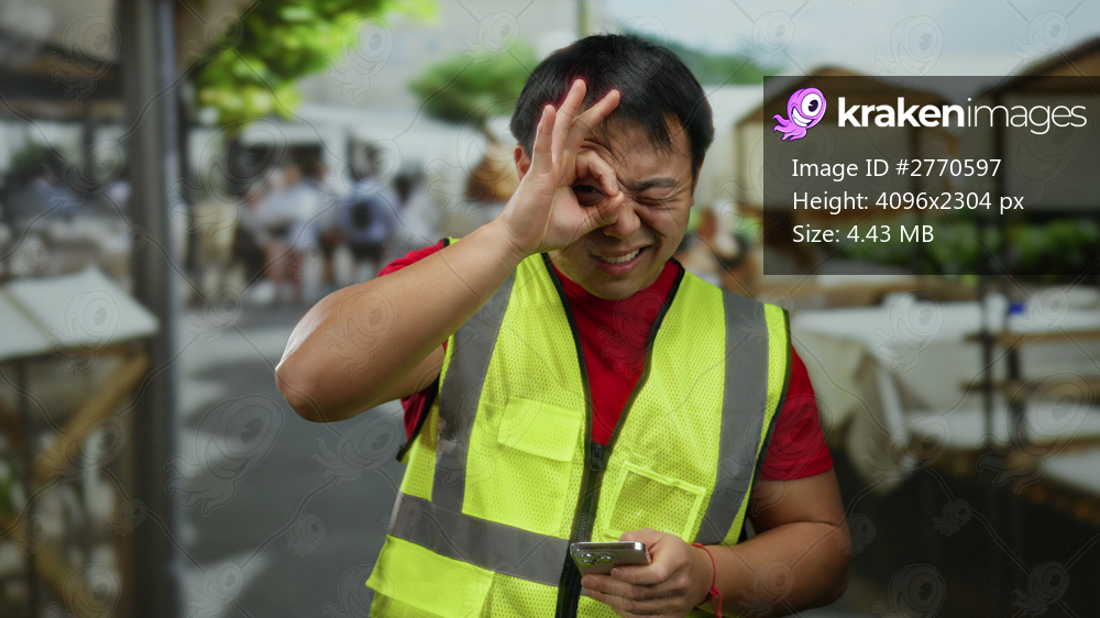 Man wearing safety vest making gesture while holding smartphone outdoors in urban cafe setting with blurred background featuring tables and chairs suggesting vibrant city life. - Kraken Images