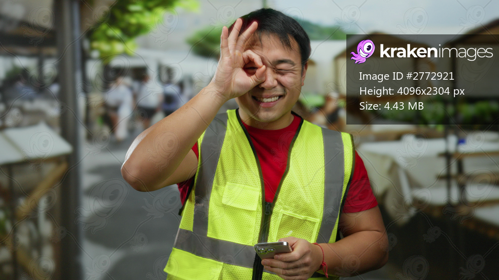 Man wearing safety vest making gesture while holding smartphone outdoors in urban cafe setting with blurred background featuring tables and chairs suggesting vibrant city life. - Kraken Images