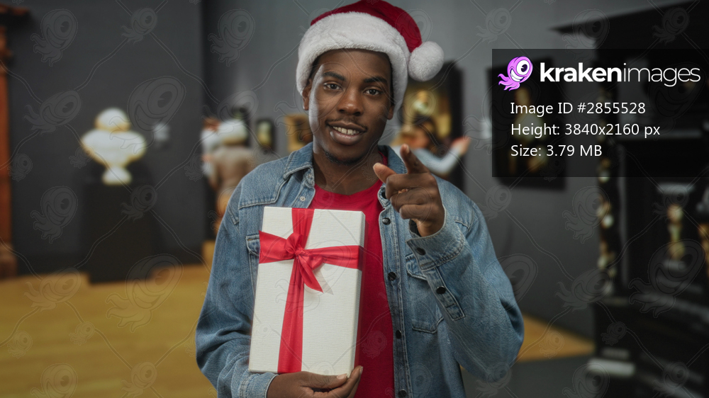 Man wearing santa hat and denim jacket holding white gift box wrapped in red ribbon and pointing finger in building; holiday joy.