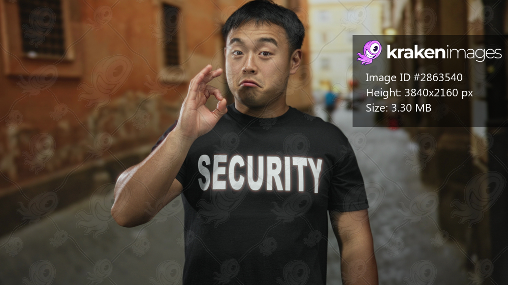 Man wearing security shirt makes ok sign with hand raised on old town cobblestone street; approval.