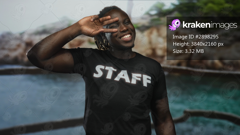Man wearing staff t shirt smiling and flashing a peace sign to his eye with visible hand and dreadlocks in studio by coastal scene out of focus; joy energy positivity. - Kraken Images