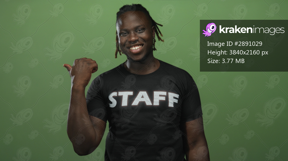 Man wearing staff t shirt smiling and giving a thumbs up in green studio with casual pose and relaxed expression; confidence.