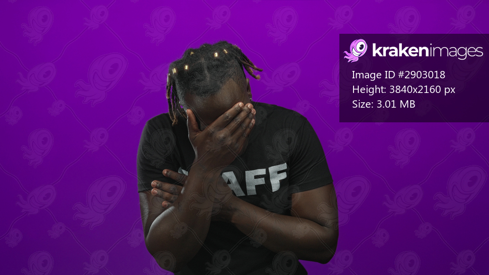 Man wearing staff tshirt covering face with hand and arms crossed in purple studio under soft lighting with dreadlocks and beads; grief vulnerability.